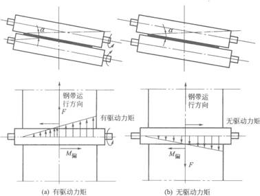 若輥子是帶驅動的,給不銹鋼帶的作用力是向前的動力,則不銹鋼帶所受到的向前的動力的合力偏向不銹鋼帶被夾緊的一端,會產(chǎn)生一個使不銹鋼帶向這一方向偏移的力偶M偏,所以不銹鋼帶是向著壓力大、輥子開口小的一端偏移。若輥子是從動的,給不銹鋼帶的作用力是向后的阻力,則會使不銹鋼帶向壓力小、輥子開口大的一端偏移。